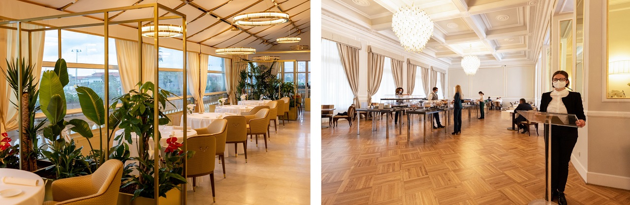 The certified environments: the two-Michelin-starred restaurant "Il Piccolo Principe" on the left and the Breakfast Room on the right.