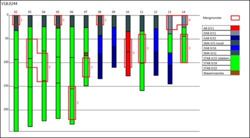 Onze standaard rapportages van het onderzoek voor CROW publicatie 210 kunnen voortaan worden aangevuld met een overzichtelijke grafische weergave van de boorprofielen (zie fig. 1). Op verzoek bieden wij u deze nieuwe gebruikersvriendelijke, grafische weergave van de opbouw van asfaltkernen inclusief de aanwezige fluorescentie.