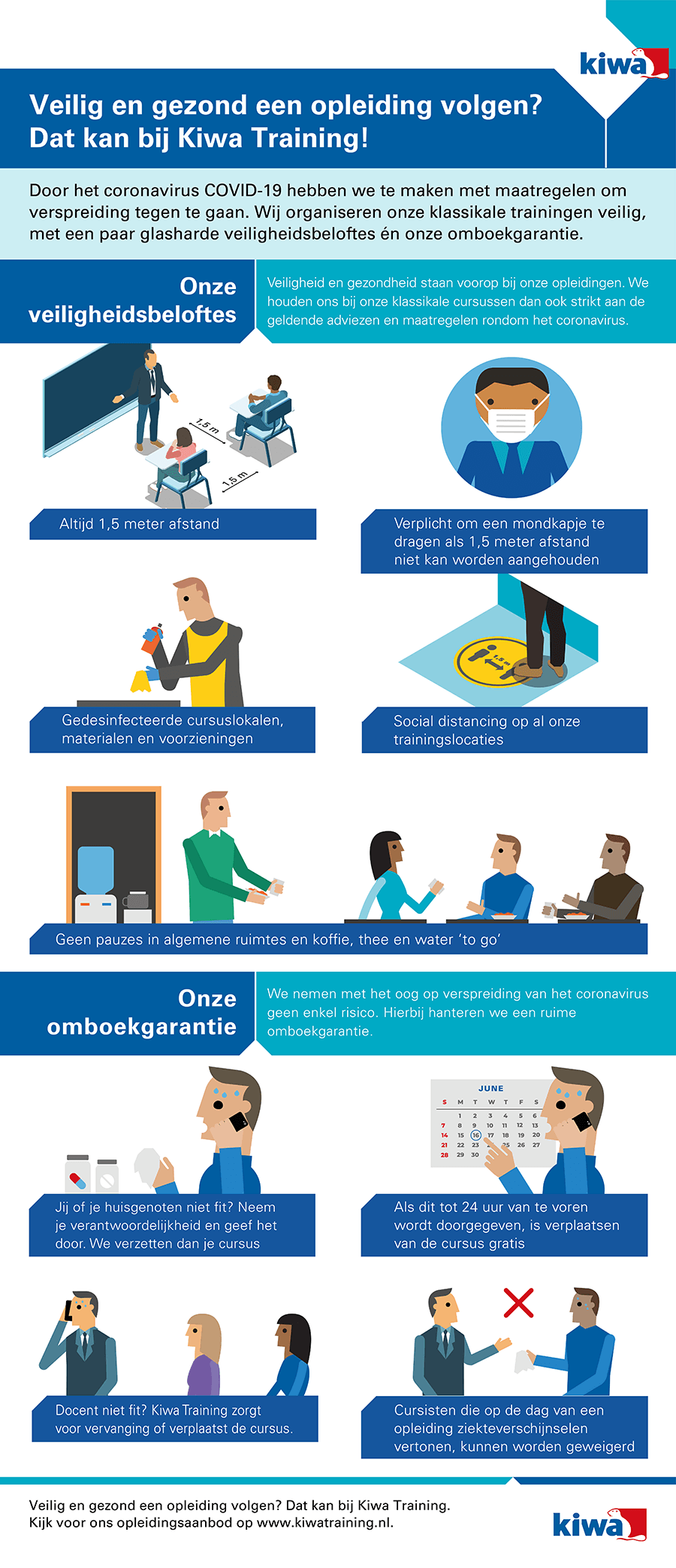 Kiwa Training volgt de ontwikkelingen rondom het coronavirus op de voet en treft daarvoor alle mogelijke maatregelen. Zo zullen de trainingen in Apeldoorn van start gaan in kleinere groepen dan normaal. Ook gelden nog steeds onze veiligheidsbeloften. Meer hierover leest u in de infographic hieronder. Ook is het mogelijk om online, vanuit huis, deel te nemen aan de trainingen.