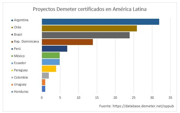 En América Latina existen 121 proyectos distribuidos en diferentes países, casi todos los productos certificados son exportados a Europa con la finalidad de satisfacer la demanda de este nicho de mercado. Argentina es el país que más proyectos con certificación Demeter posee, seguido de Chile y Brasil.