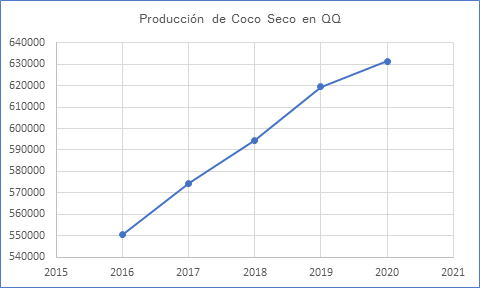 El coco y sus derivados son considerados como productos exportables de República Dominicana, según los datos publicados por el Viceministerio de Planificación Sectorial Agropecuaria - Departamento de Economía Agropecuaria y Estadísticas; la producción de coco seco en QQ ha aumentado a lo largo de los años e indica una tendencia de crecimiento. A continuación, un gráfico con los datos obtenidos:
